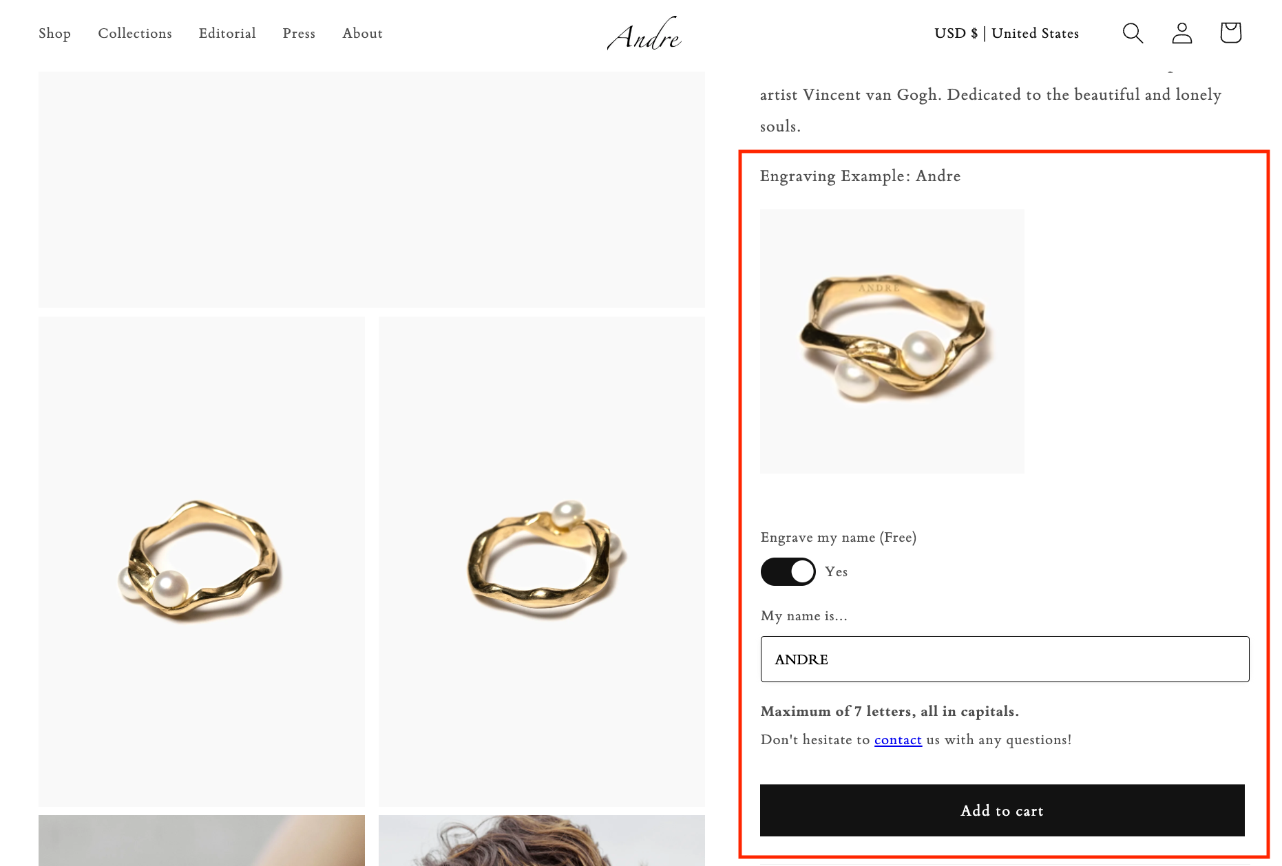 On the product page, above the 'Add to Cart' button, you’ll find the engraving option and text box. Simply type the name you'd like engraved — up to 9 letters, all in capitals.